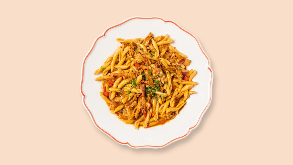 Gezupftes BBQ Pulled Pork (optional vegan) mit Strozzapreti Nudeln, Paprika, Zwiebeln, getoppt mit Röstzwiebeln
