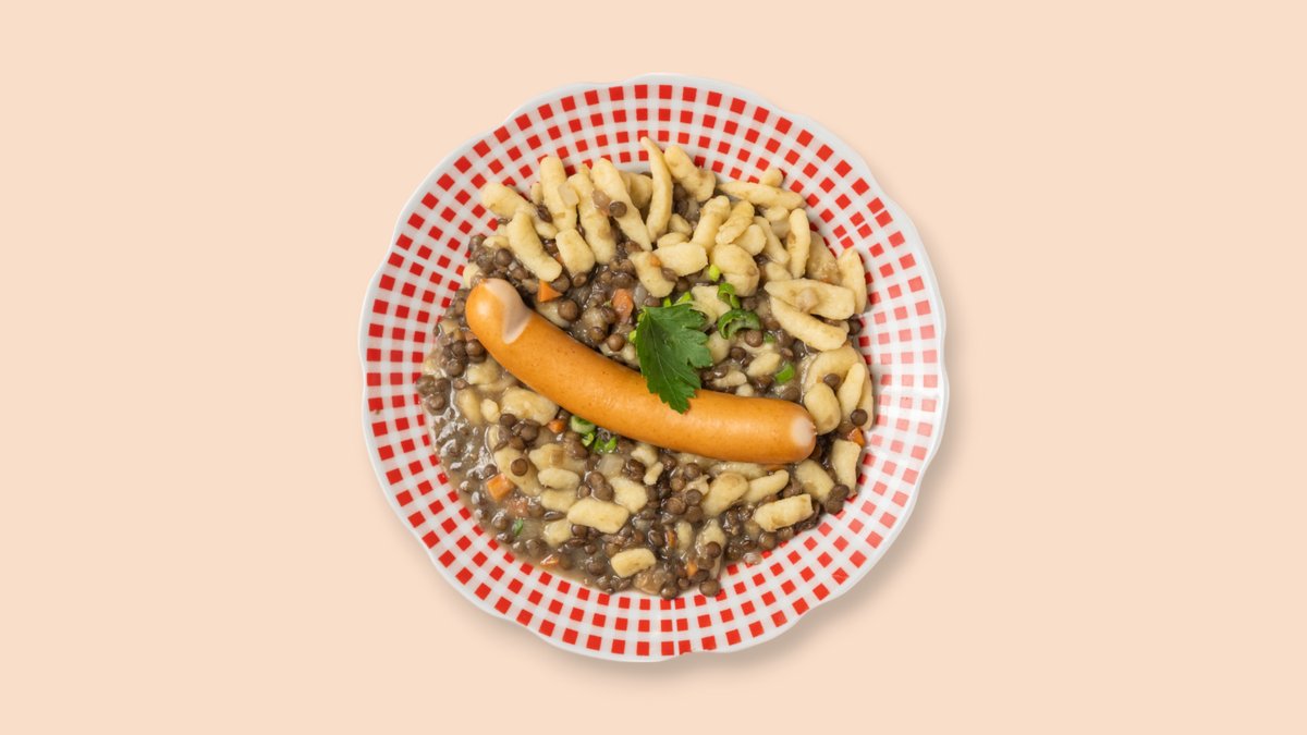 Stuttgart lässt grüßen: Spätzle mit leckeren Linsen, einer Bockwurst (optional vegetarisch) und einem Schuss Balsamico Essig
