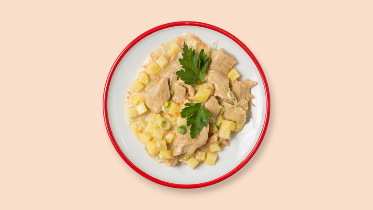 Wie bei Oma, nur hier mit Kartoffeln, Hähnchen (optional vegan), Erbsen und Lauchzwiebeln