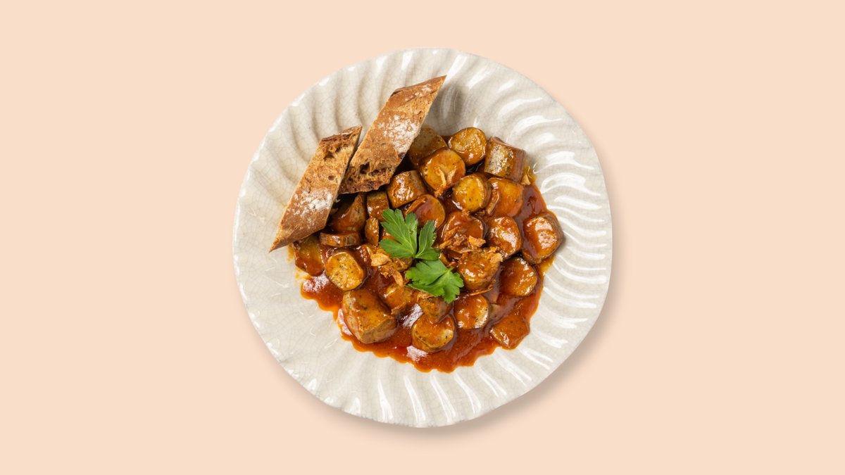 Sprichwörtlich aus'm Pott: Bratwurst (optional vegan) in leckerer Currysauce mit einem Zwiebelbaguette dazu