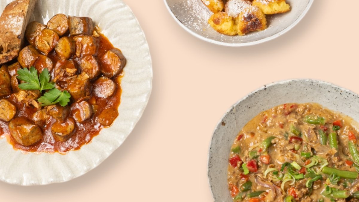 Ein leckeres Allerlei: Hähnchen (optional vegan) mit Spätzle, Champignons und Erbsen getoppt mit Röstzwiebeln