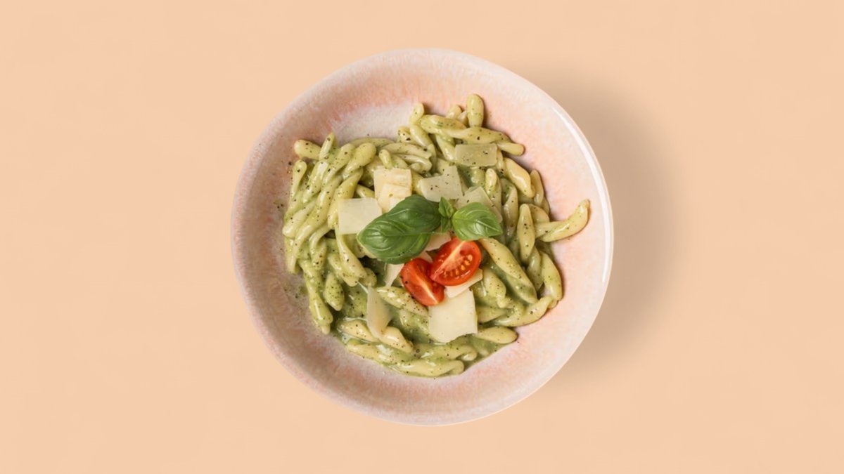 Kurze, gedrehte Strozzapreti Nudeln al dente gekocht in cremigem grünem Pesto mit Parmesan separat dazu