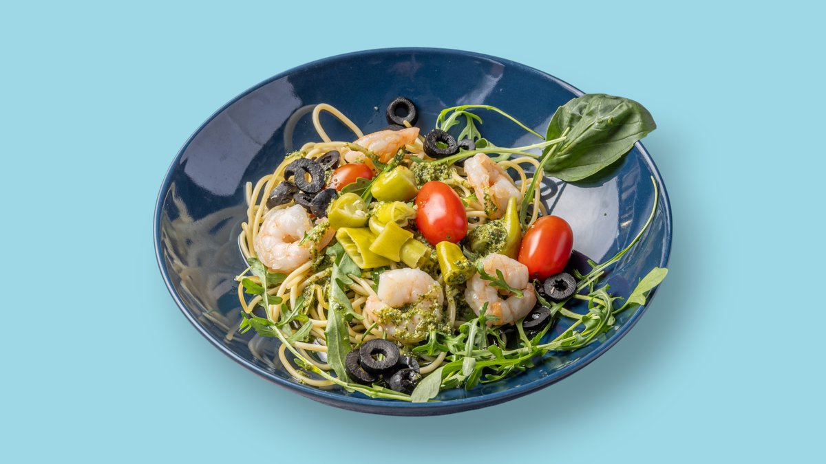 mit Krabben, Oliven, scharfer Peperoni, frischer Paprika, Olivenöl und Knoblauch