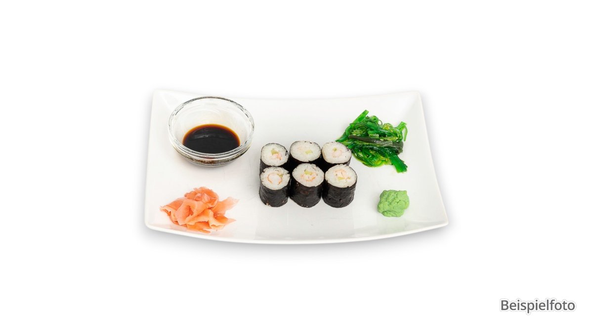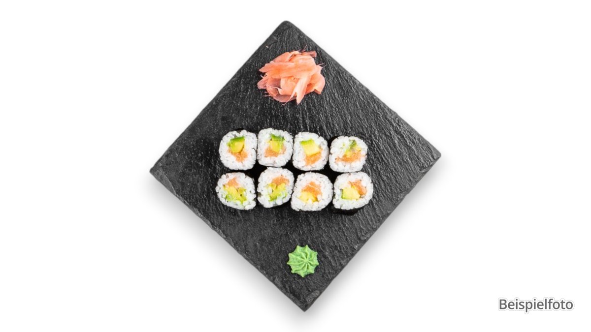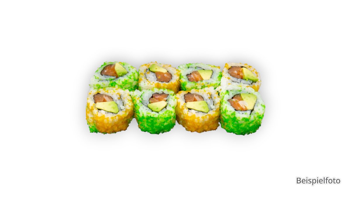 jede Portion enthält 8 Stück und wird mit Avocado zubereitet („Gurken Sake Uramaki” wird ohne Avocado zubereitet)