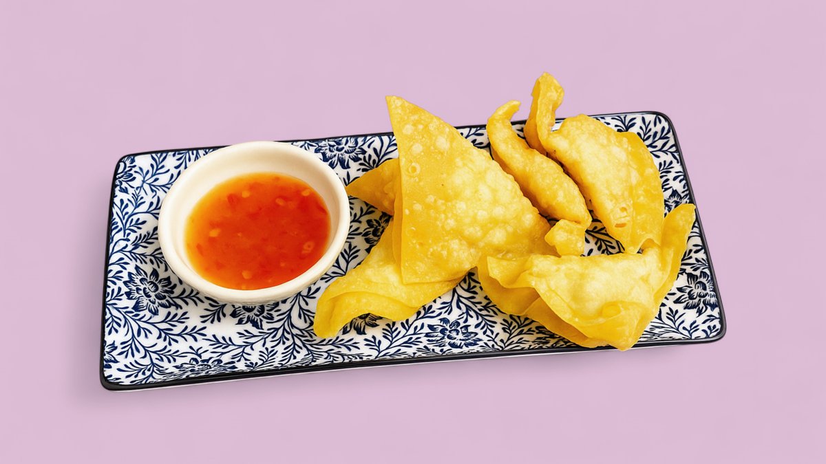 6 Stück hausgemachte Wan-Tan, knusprig gebacken mit Hähnchen und Garnelen und Süß-Sauer-Soße