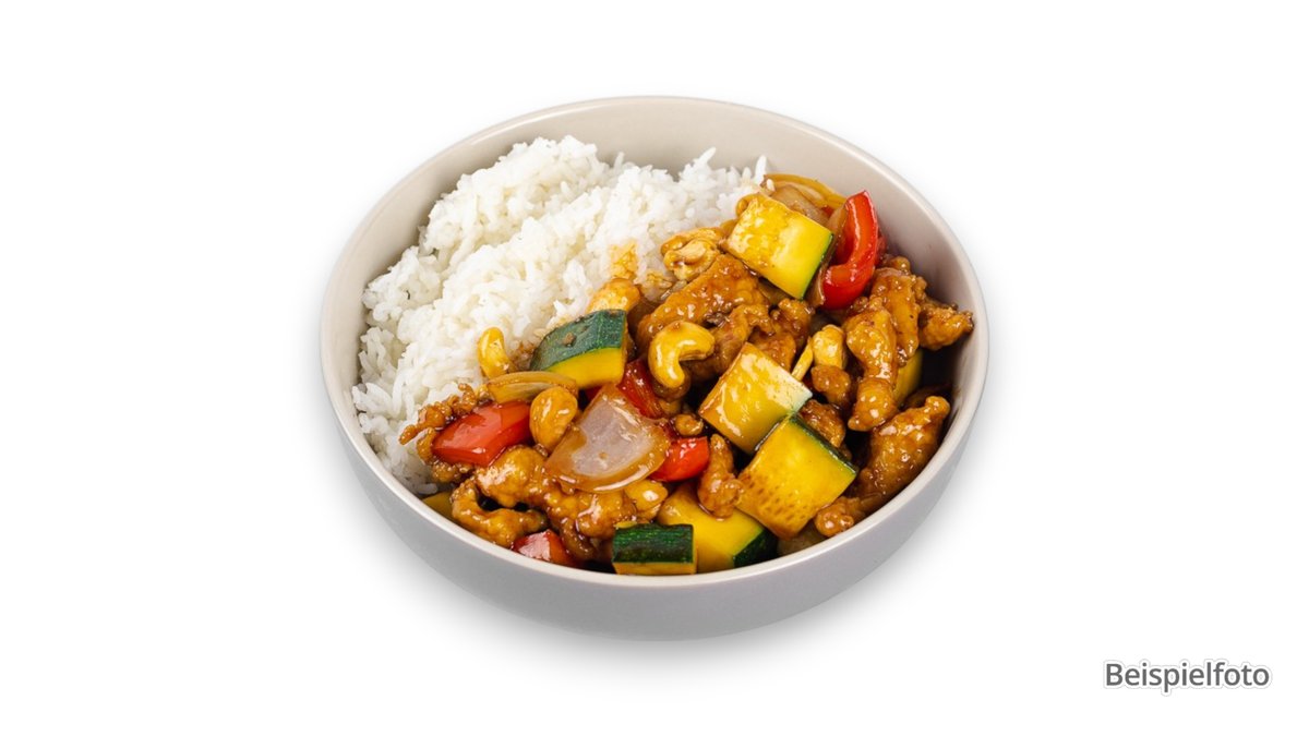 alle Gerichte werden mit verschiedenem Gemüse zubereitet und mit Reis serviert („Gebratenes Hähnchen mit Zwiebeln” wird ohne verschiedenes Gemüse zubereitet)