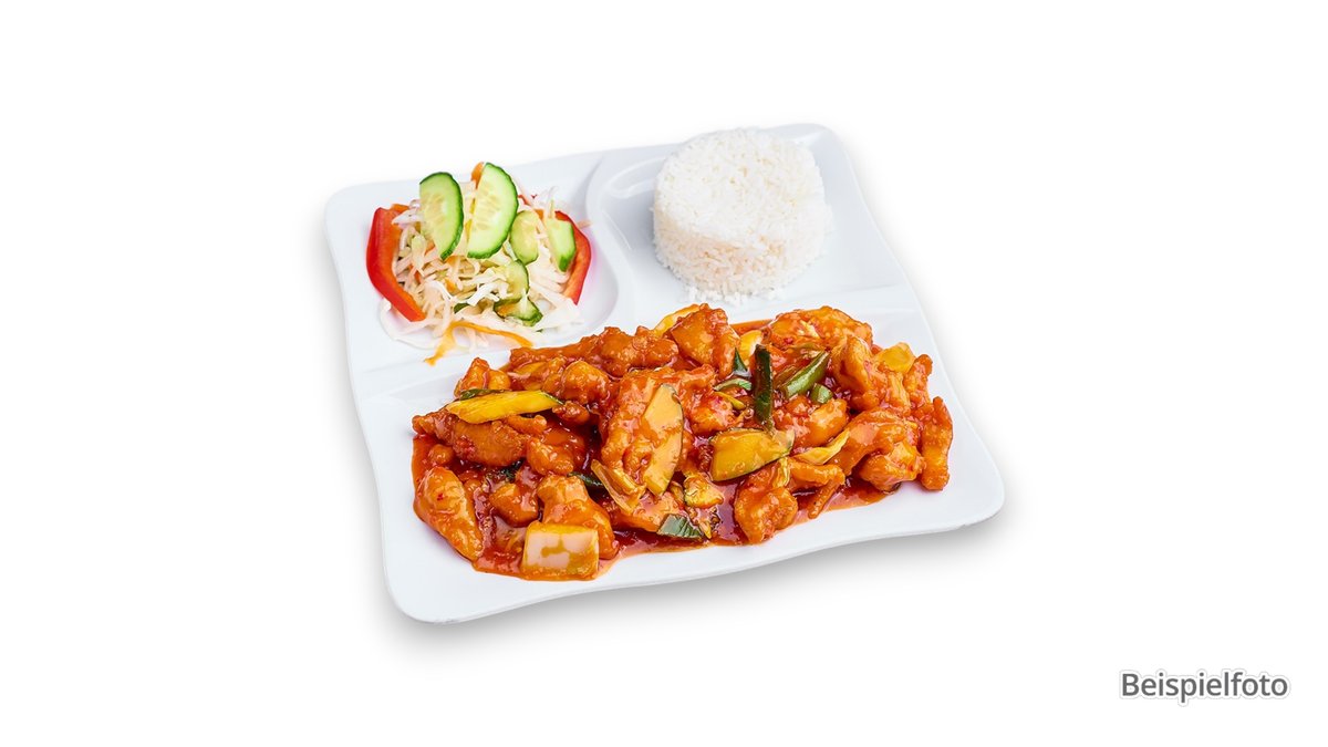 alle Gerichte werden mit Reisnudeln, Salat, frischen Kräutern, Gurken, Zwiebeln und Karotten zubereitet und mit hausgemachter Süß-Sauer-Soße serviert („Alles Gute” wird ohne Salat, frischen Kräutern, Gurken, Zwiebeln und Karotten und „Asia Ecke Mix Menü” wird ohne Gurken zubereitet)