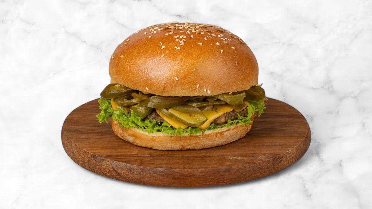 mit Rindfleischpatty, Cheddar, Jalapeños, Chilisoße und Chili-Käsesoße
