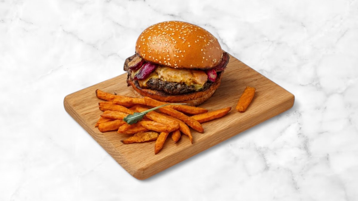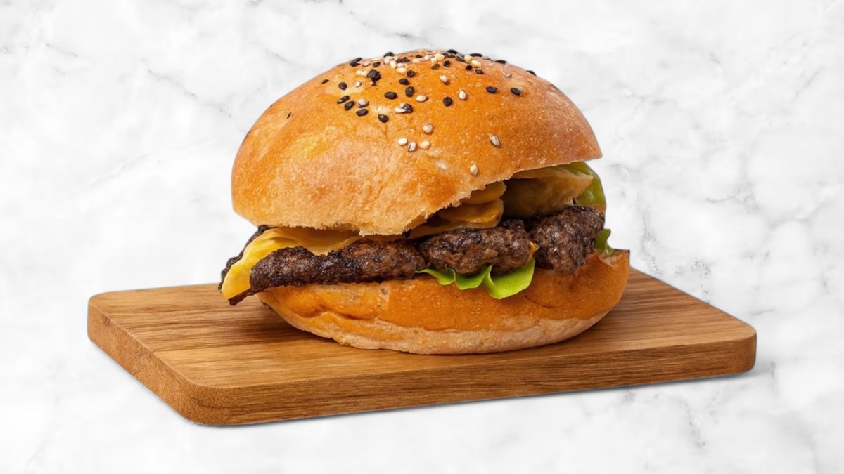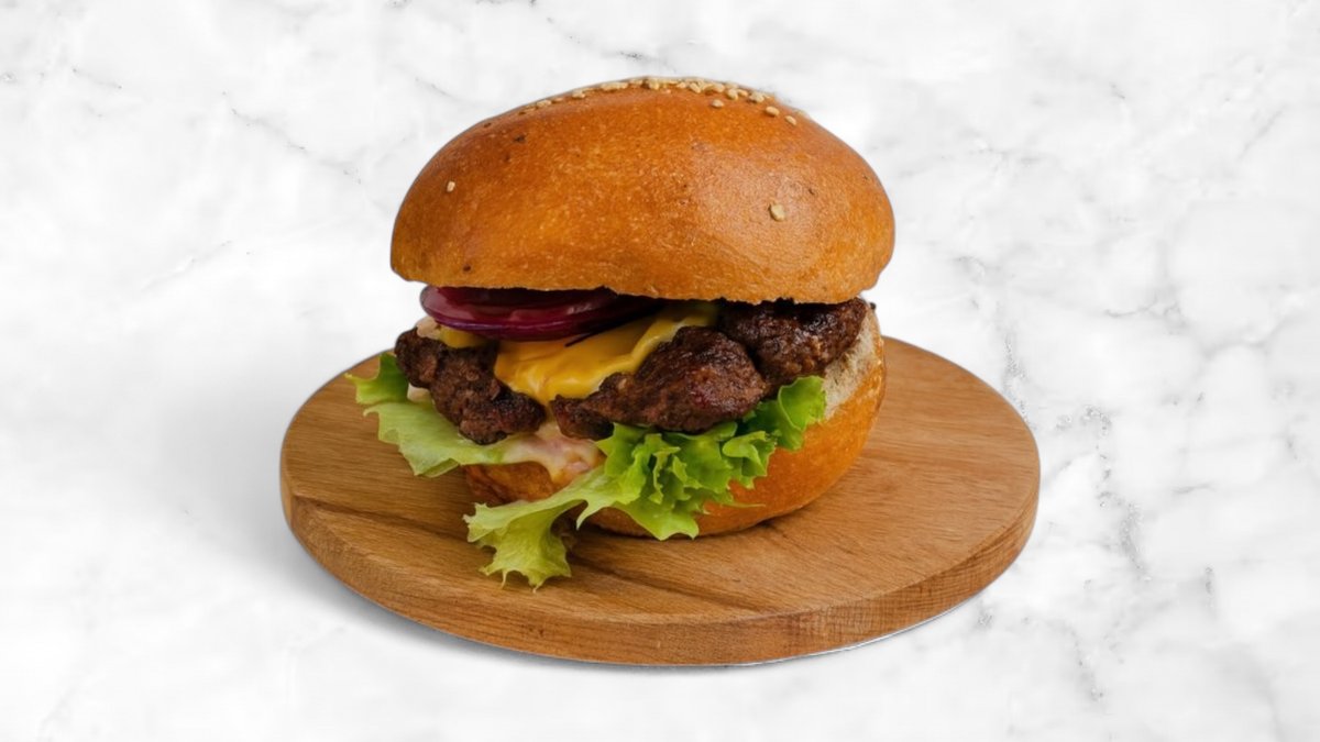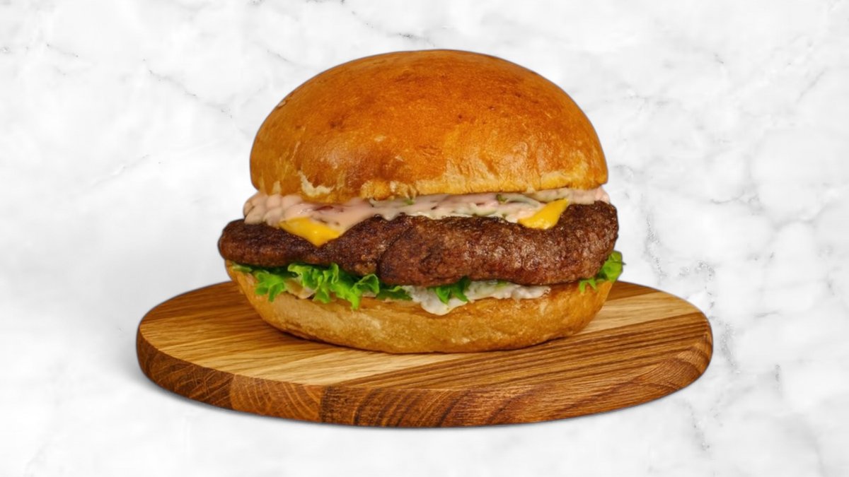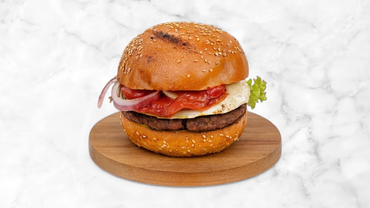 mit Rindfleischpatty, Speck vom Rind, Zwiebeln, Schmelzkäse und Spiegelei