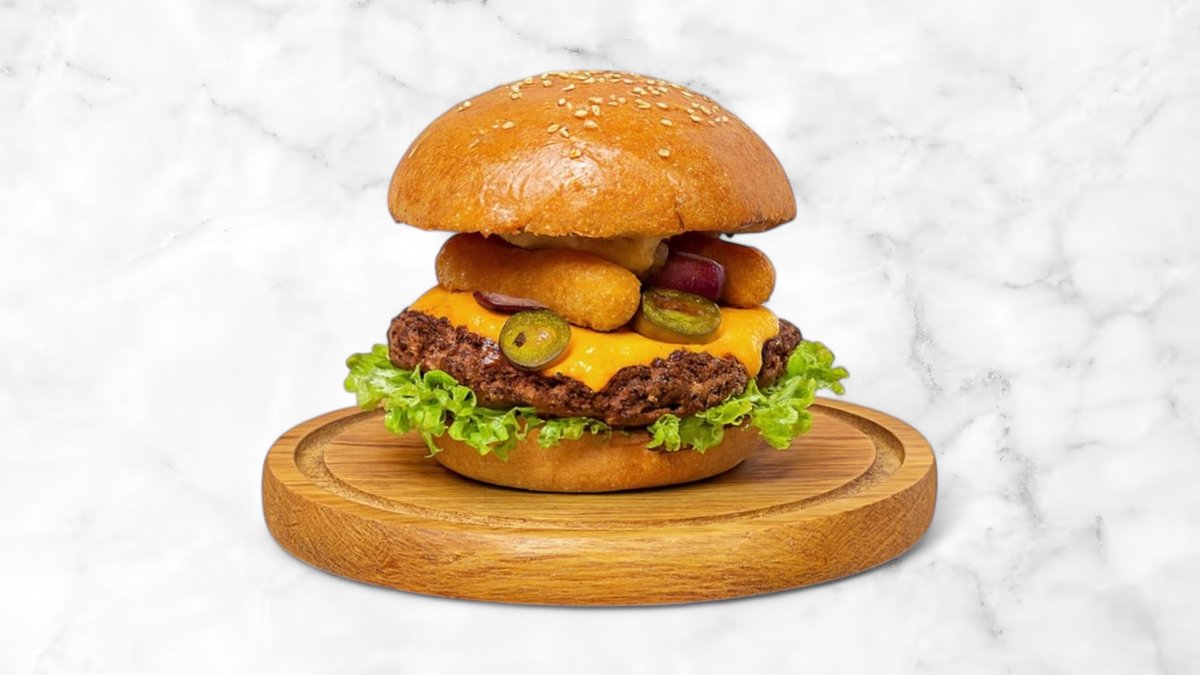 mit Rindfleischpatty, Mozzarella Sticks, Schmelzkäse, Jalapeños, Point-Burgersoße und Yoppie-Soße