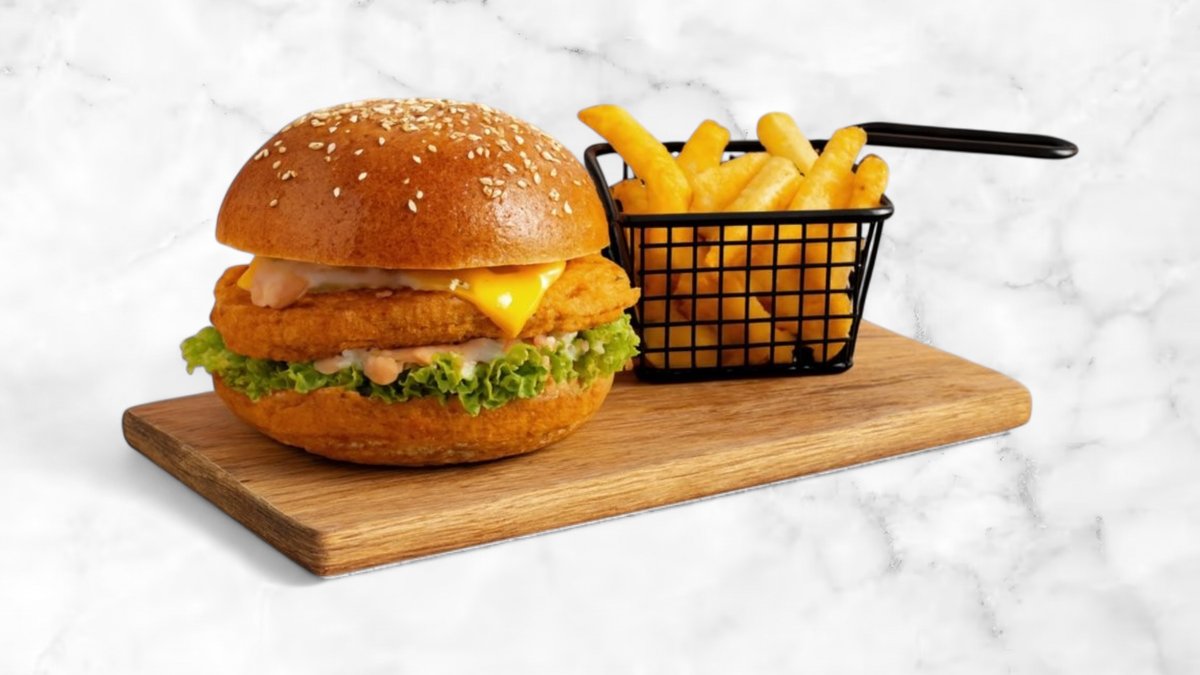 mit knusprigem Hähnchenpatty, Cheddar und Currysoße