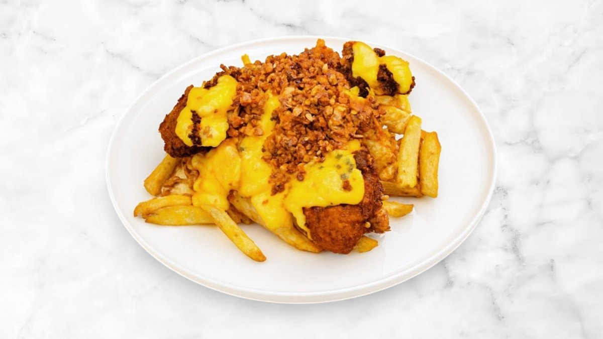 mit paniertem Hähnchenpatty, Cheddar und Currysoße