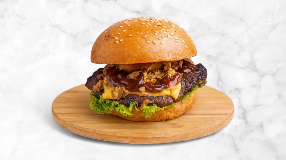 mit Rindfleischpatty, Röstzwiebeln, Zwiebelringen, Cheddar und Barbecuesoße