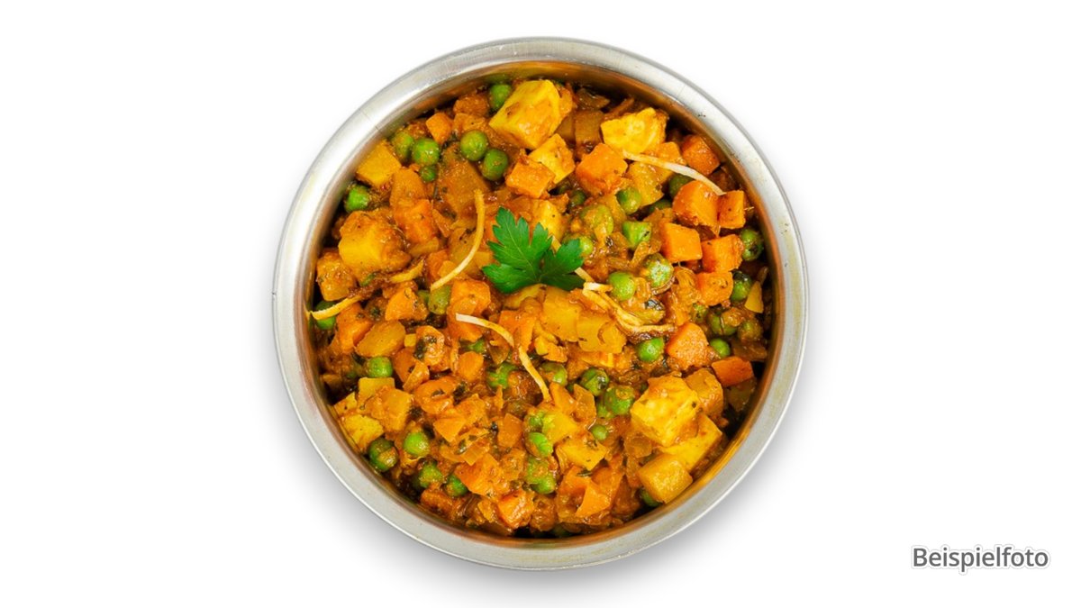 mit gemischtem Gemüse und milder Buttersoße, verfeinert mit Sahne, Mandeln, Cashews und Rosinen