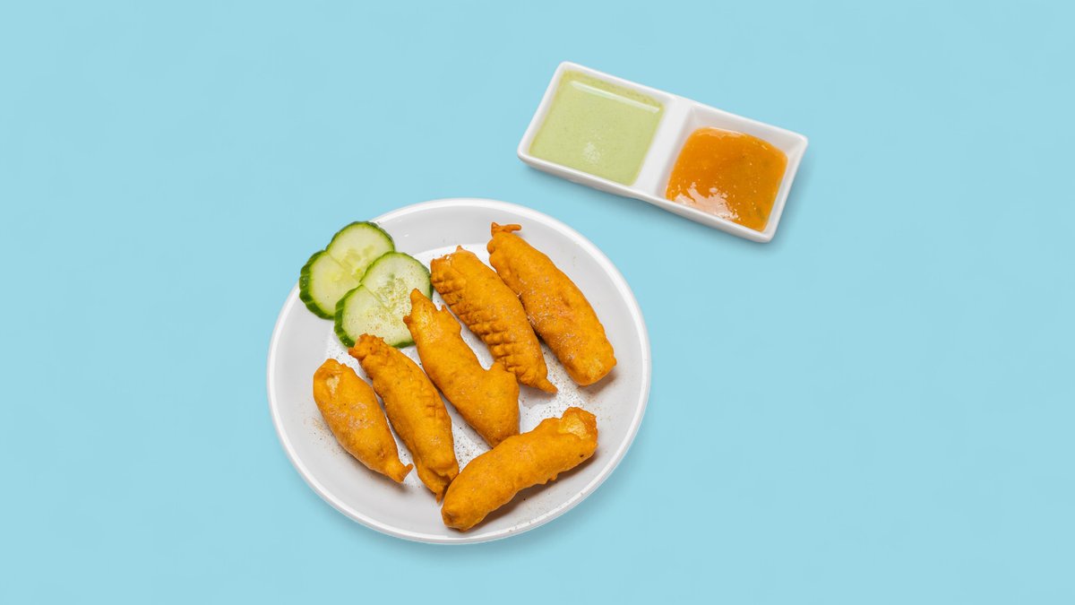 6 Stück, frittiert mit Zwiebelringen in Kichererbsenteig frittiert