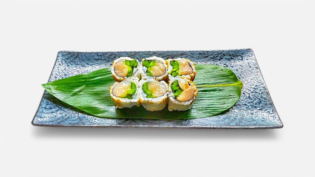 mit Tempura Garnelen, Avocado, umhülltem scharfem Lachs und Spezialsoße