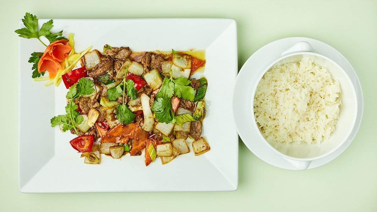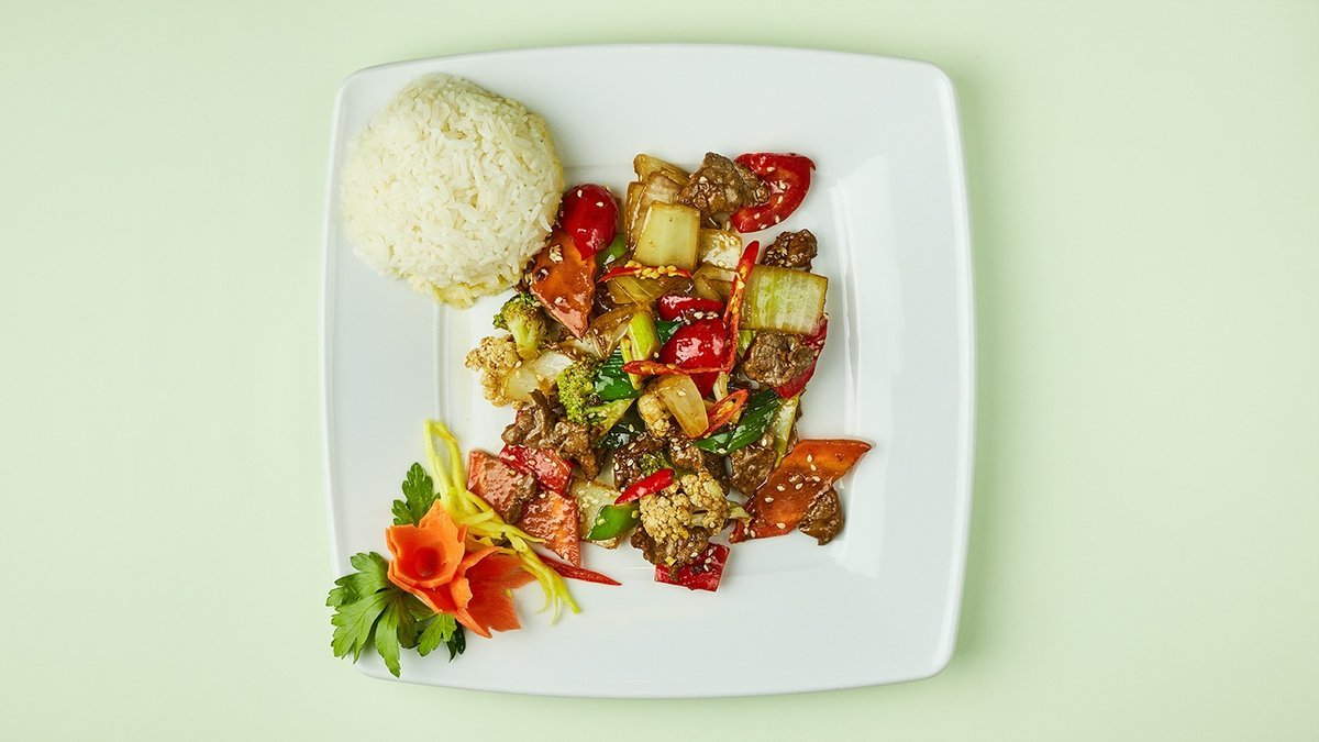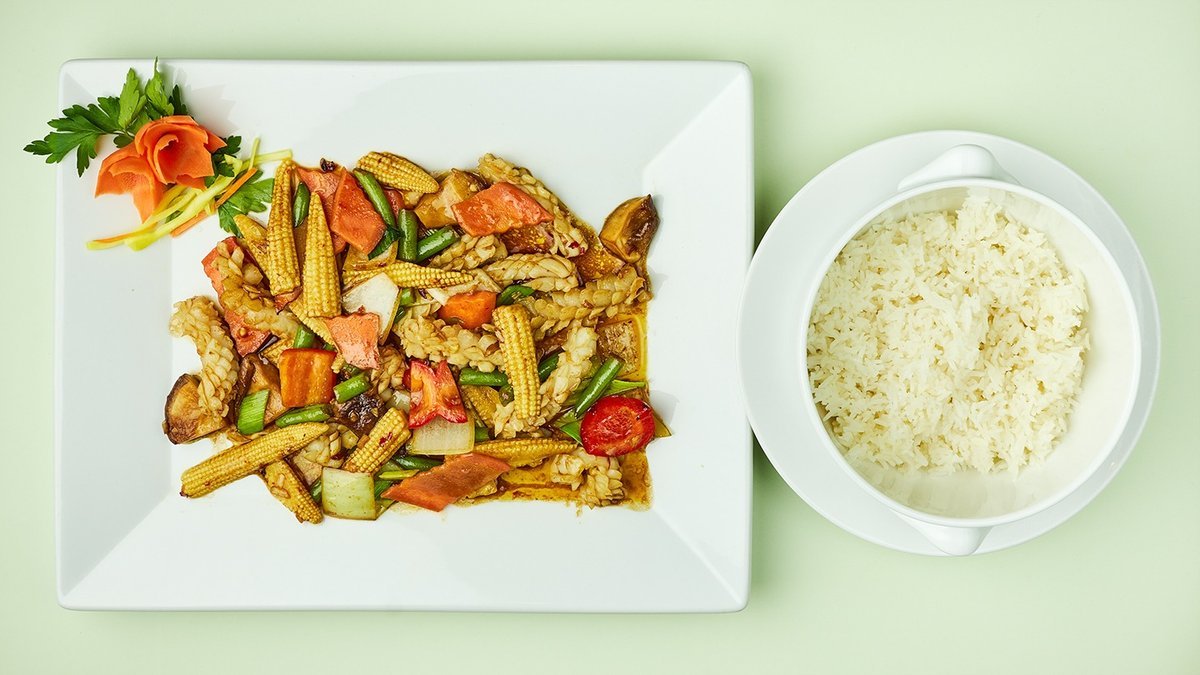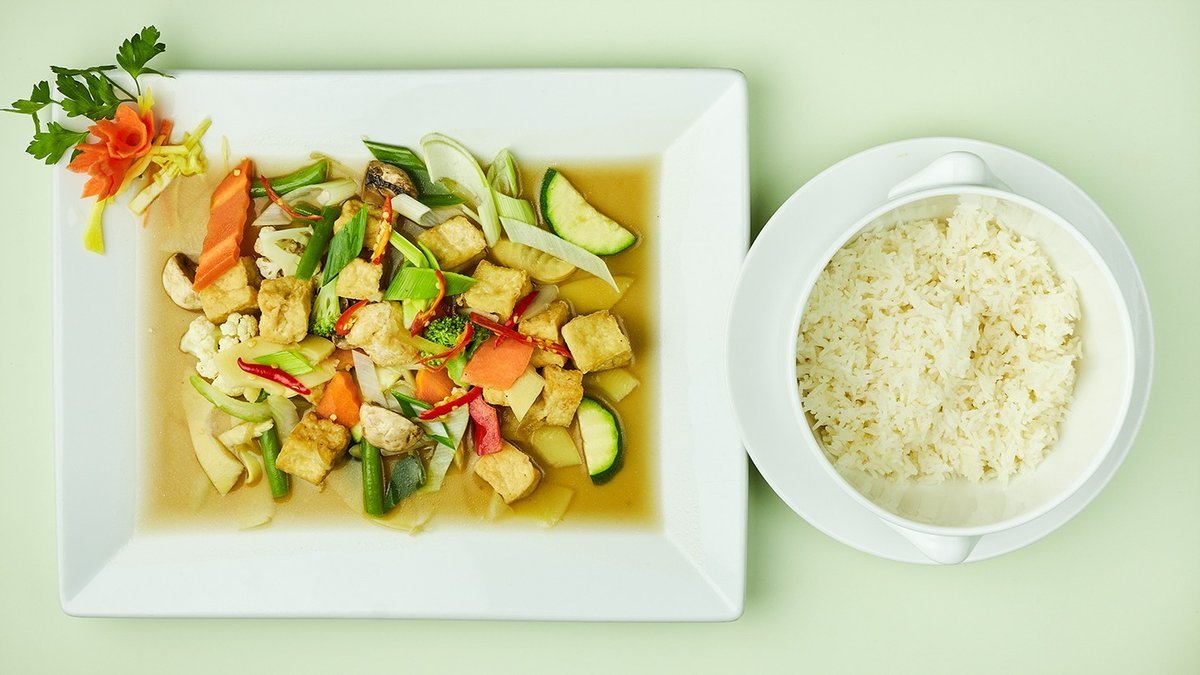 alle Gerichte werden mit Duftreis, Gemüse und Knoblauch zubereitet