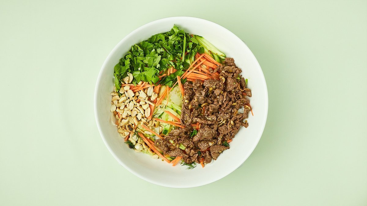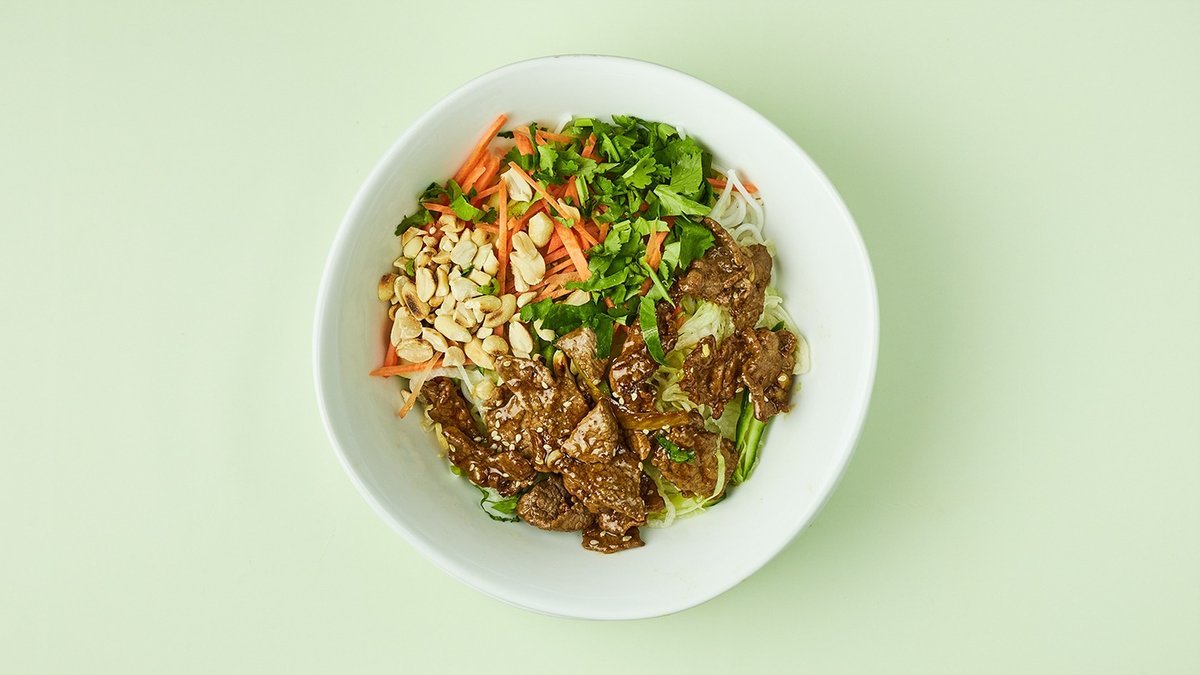pikant mit Reisnudeln, mariniertem Rindfleisch, Zitronengras, Kräutern, Salat, Erdnüssen und An-Nam-Fischsoße
