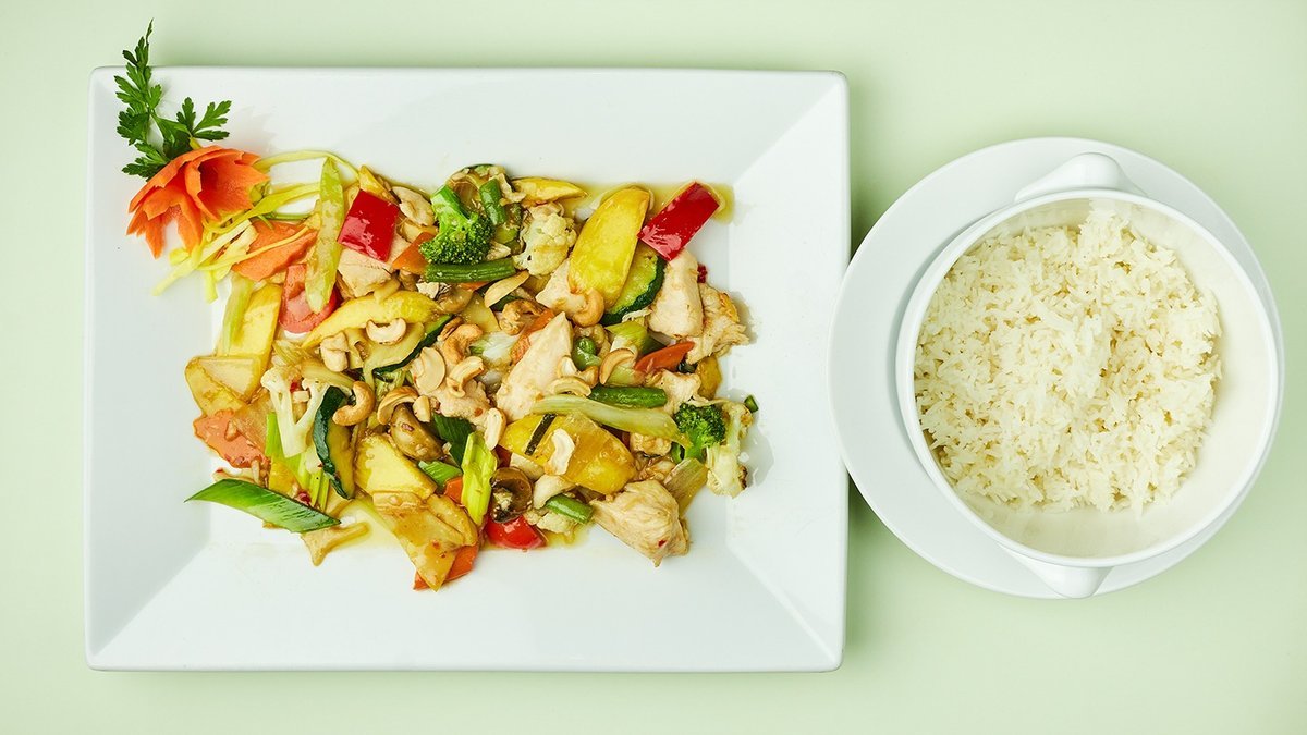mit Hähnchenbrustfilet, frischer Mango, Gemüse und Cashewnüssen