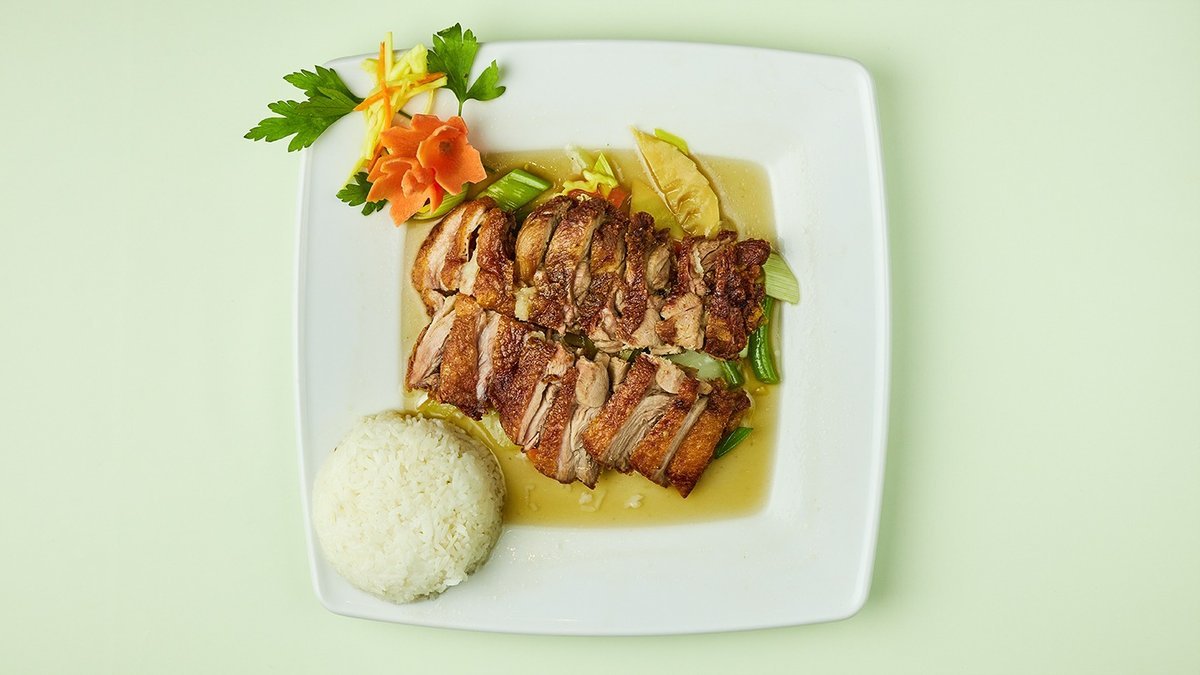 alle Gerichte werden mit knuspriger Ente zubereitet und mit Reis serviert („73. Vit Xao Hung Que” wird mit gebratenen Entenbruststreifen zubereitet)