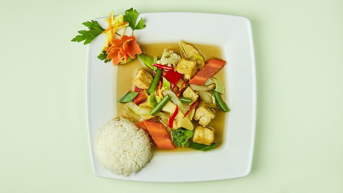 alle Gerichte werden mit Reis, gebratenem Tofu und Gemüse zubereitet zubereitet („63. Cac Loai Rau Xao” wird ohne gebratenen Tofu zubereitet)