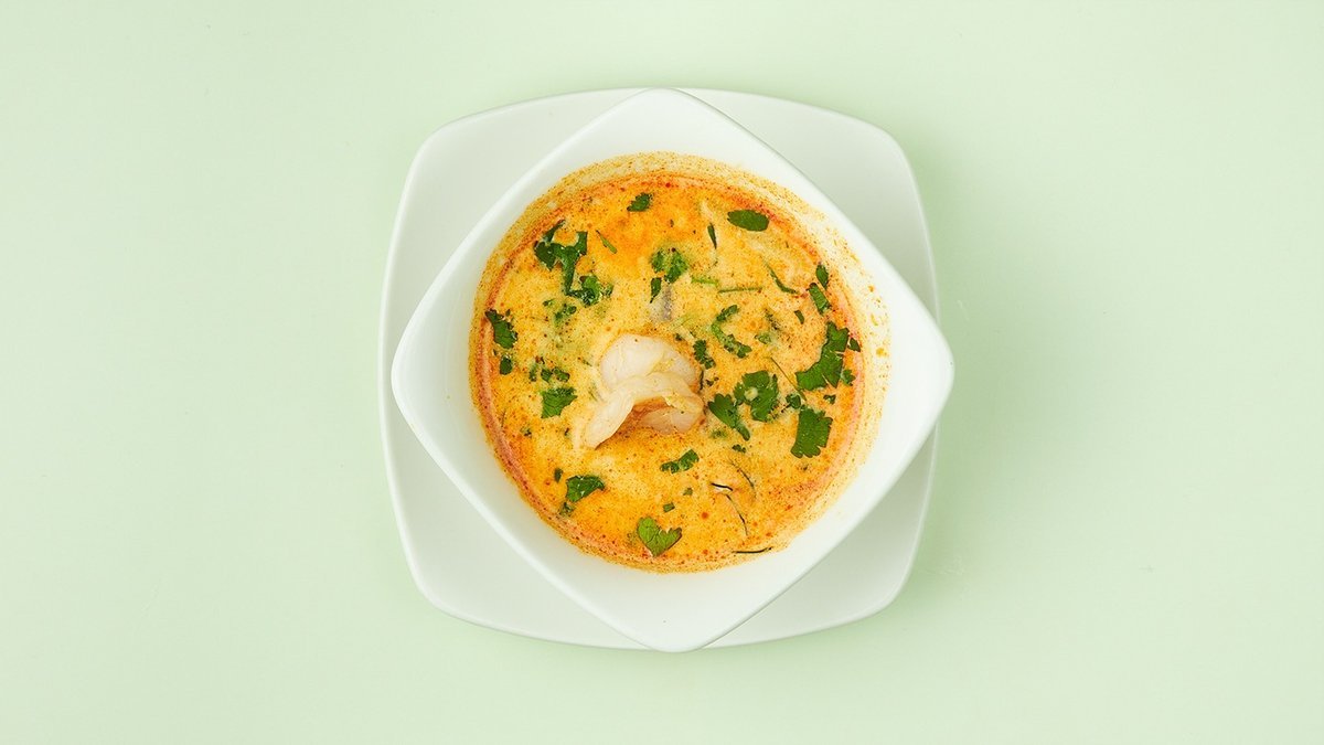mit Kokosmilch, gebratenem Hähnchenbrustfilet, Zitronengras, Chili und frischem Gemüse