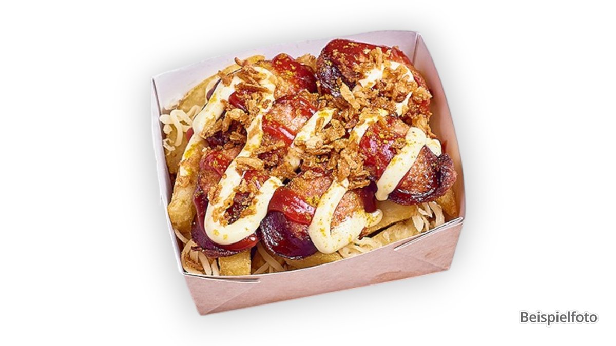 Döner auf Pommes frites und Soße in einer Größe deiner Wahl