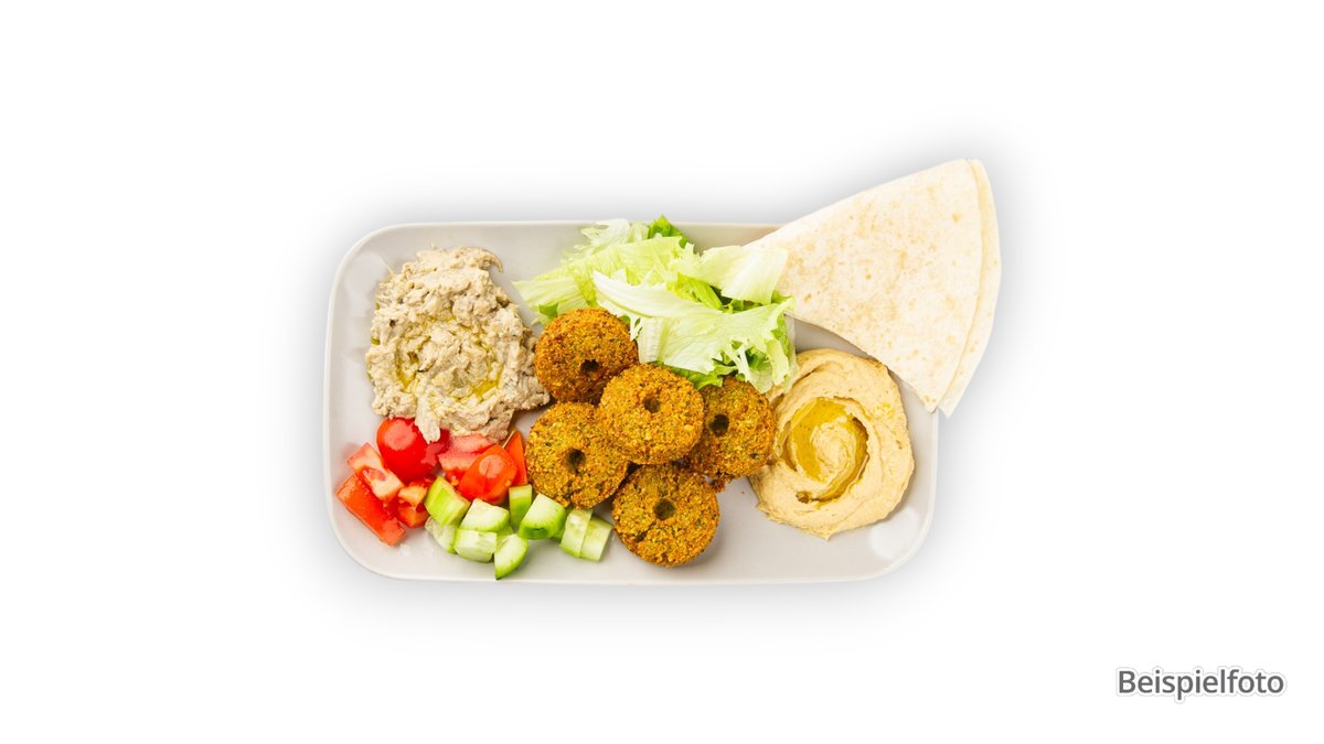 mit weißen Bohnen, Hirse, Mais, Tomaten, Gurken, Oliven, Feta, Paprika, Porree, Möhren, Krautsalat und in einer Größe deiner Wahl