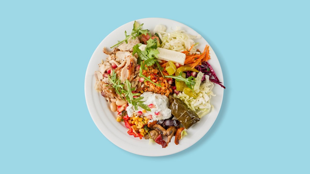 Hähnchendönerfleisch mit Bauernsalat, Krautsalat, Hirsesalat, Schafkäse, Peperoni, Bohnen und Mais