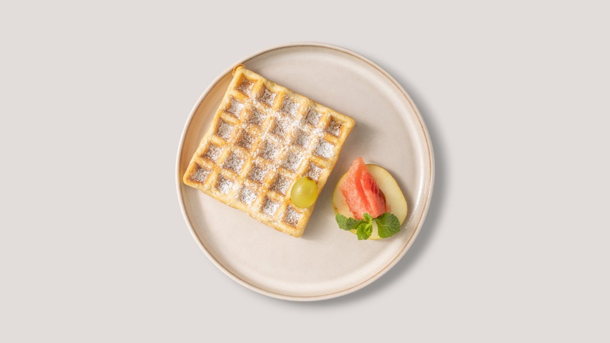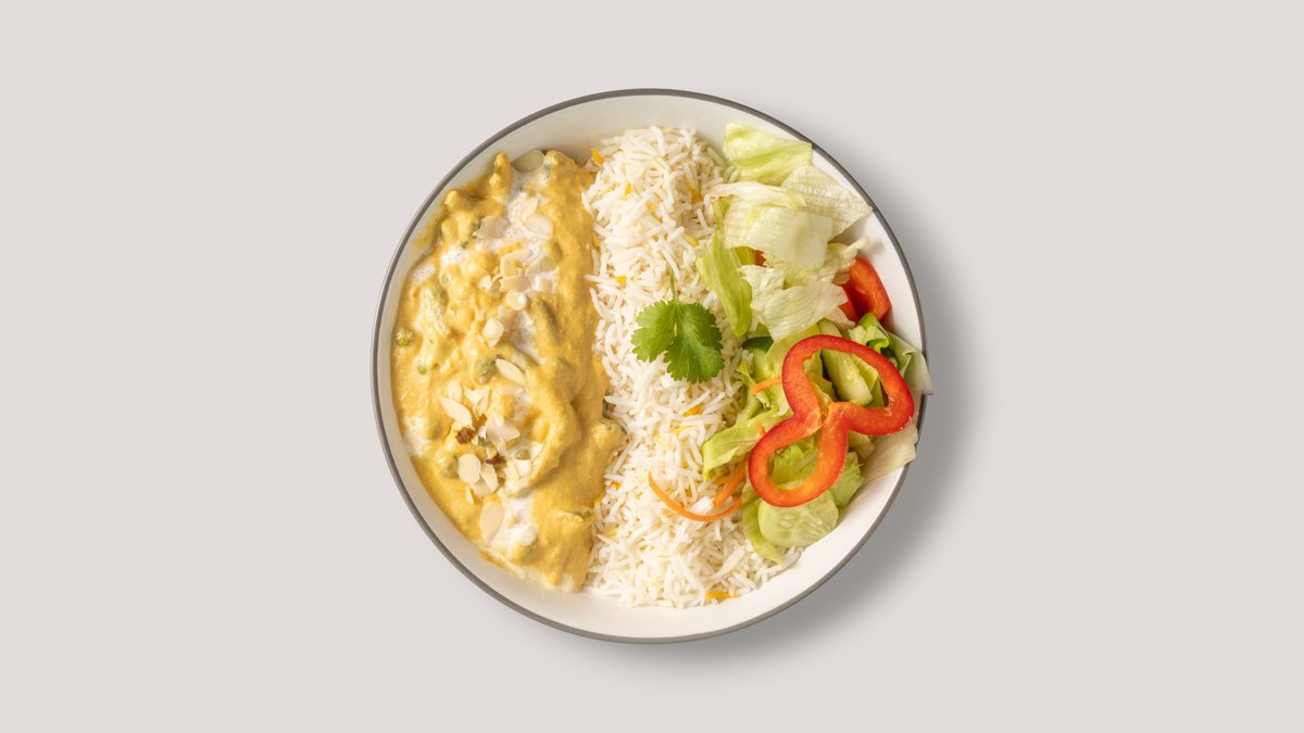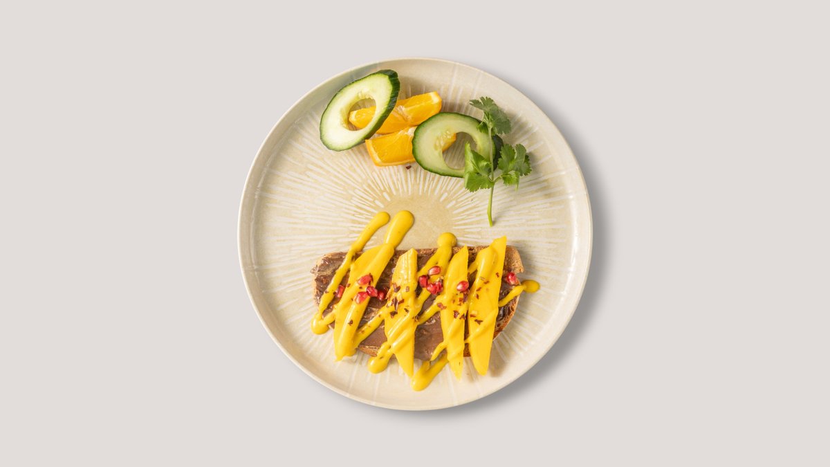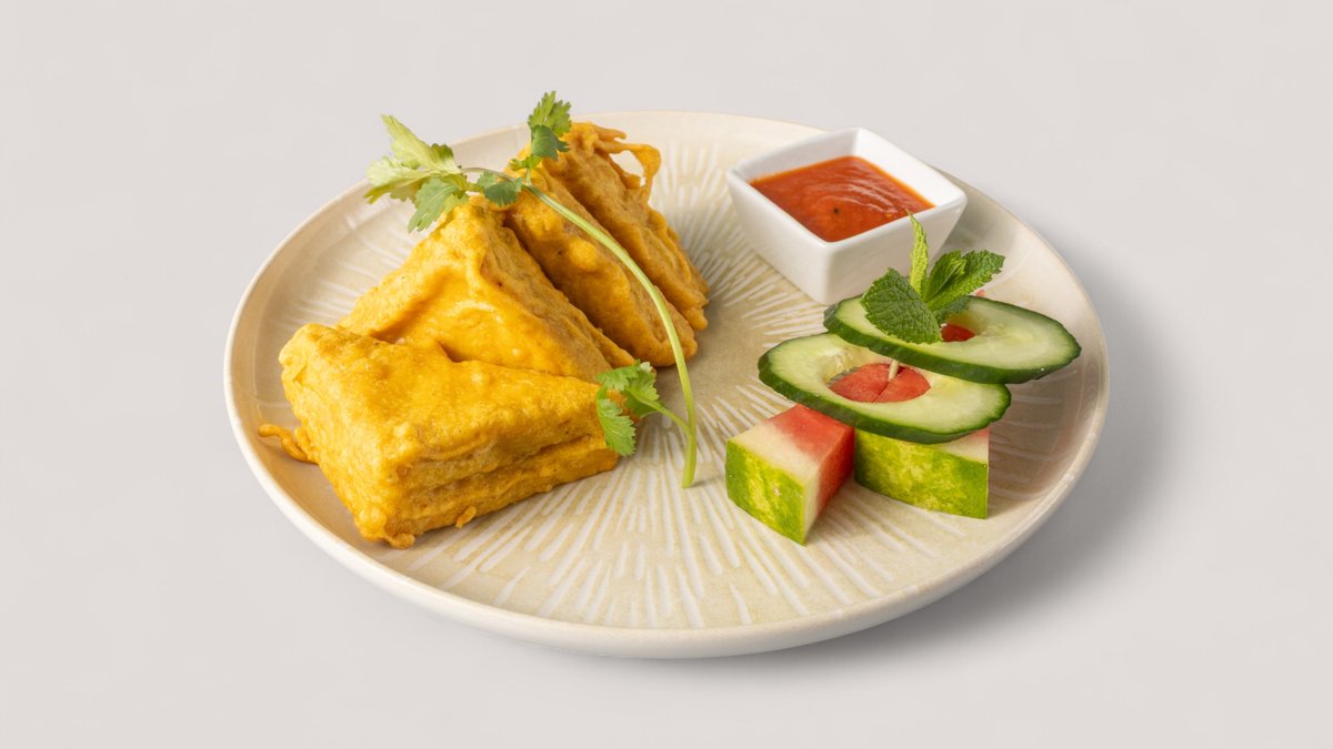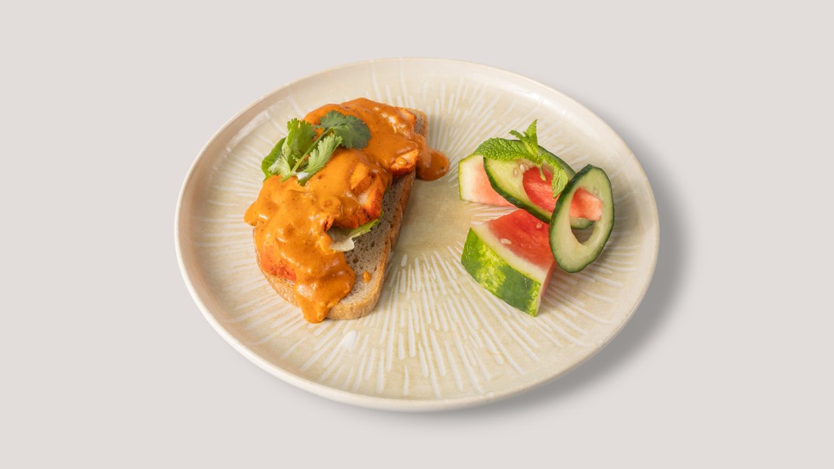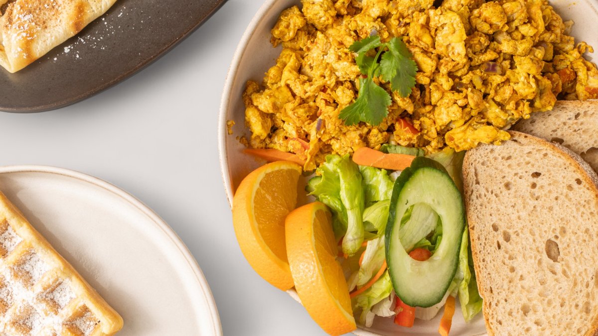 mit einer Stulle nach Wahl, indischem Rührei, Bread Pakora, Mango-Joghurt und einer kleinen Portion Salat