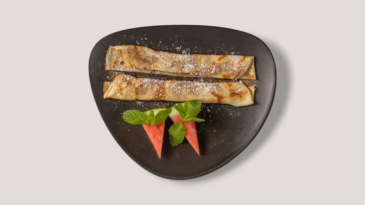Sauerteigbrot mit Nougatcreme und Erdnussbutter, verfeinert mit Mangosoße, Chiliflocken und Granatapfel