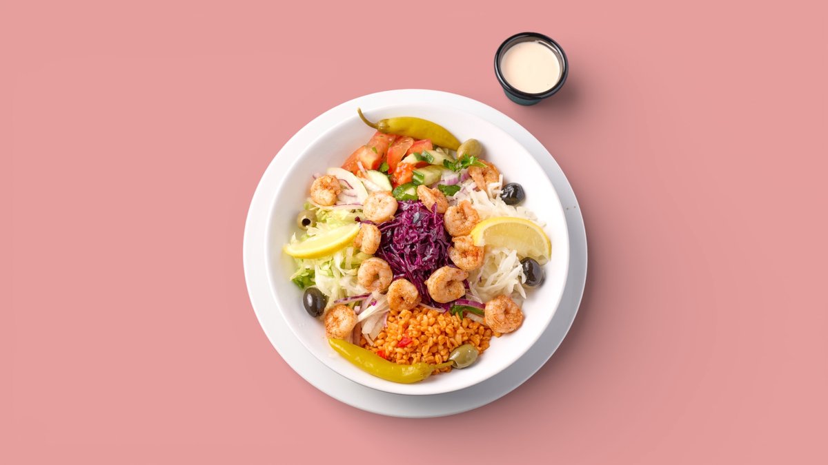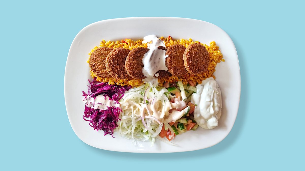 alle Gerichte werden mit Salat und Soße zubereitet („42. Vegetarische Box” und „46. Falafel-Box” werden ohne Salat zubereitet)