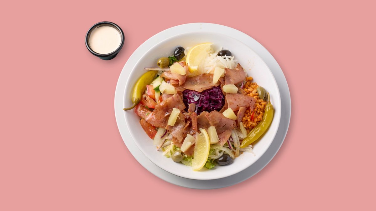 gemischter Salat mit Oliven, Peperoni, Käse und einer Fleischsorte deiner Wahl