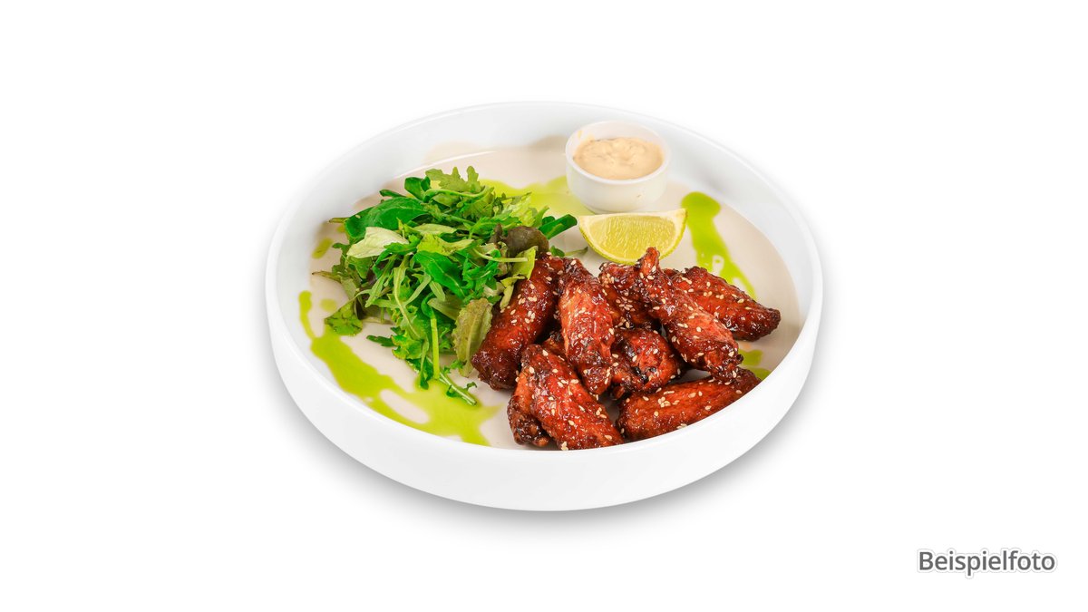 alle Gerichte werden mit einer Beilage deiner Wahl, Salat und Soße serviert („115. Geflügel-Currywurst” wird ohne Beilage deiner Wahl, Salat und Soße serviert)