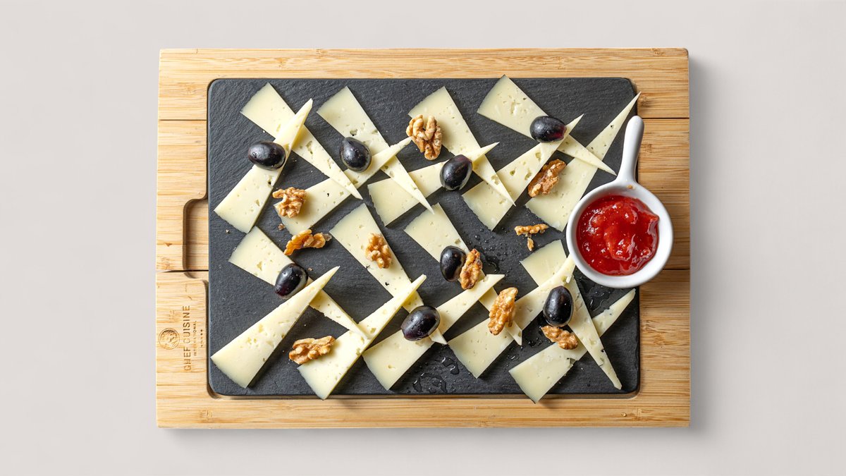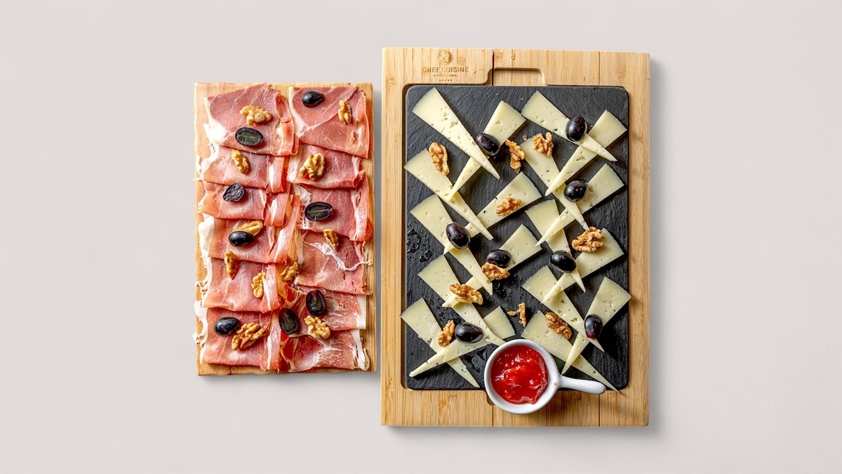 eine Tapasplatte veredelt mit zartem Serrano Cruce Duroc, Manchego-Käse, Oliven und Brot mit Aioli