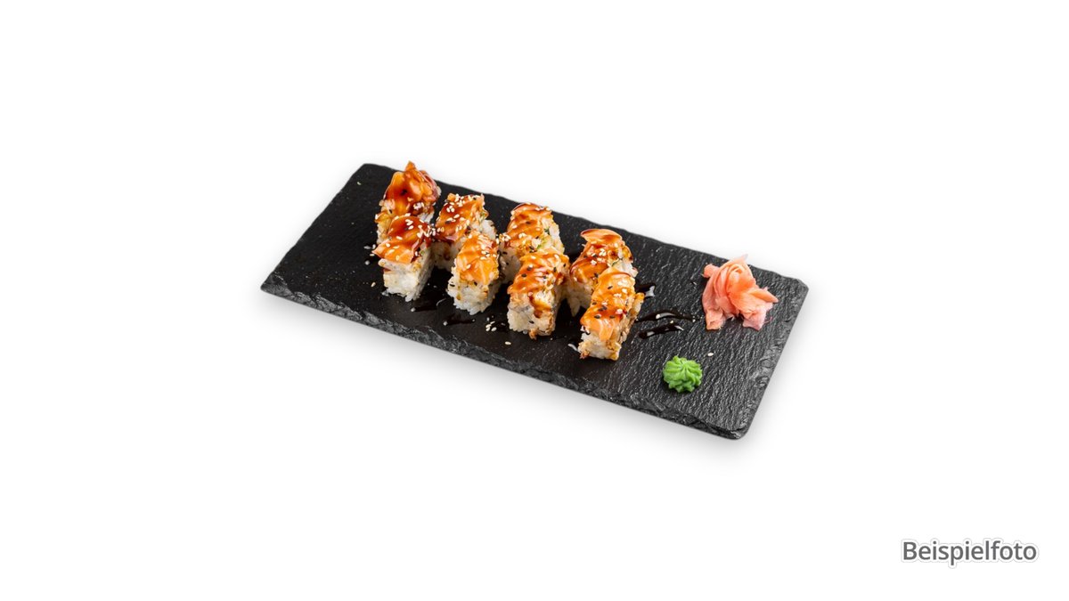 8 Stück flambierter Lachs, Black Tiger Garnele in Tempura, Mango & Tobiko