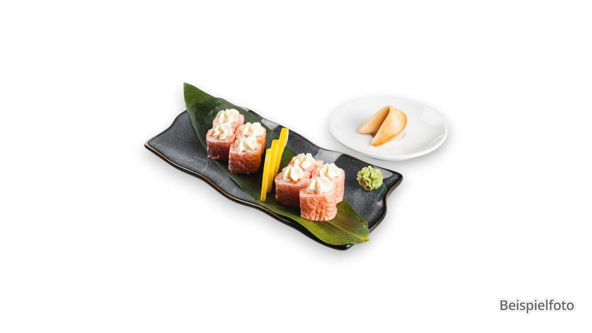 8 Stück geräucherter Aal, Lachs, Tamago, Tobiko & Frischkäse