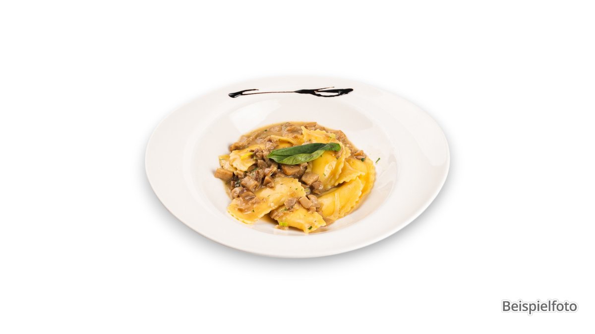 hausgemachte Ravioli mit Fleischfüllung vom Rind, verfeinert mit Champignons, Butter-Salbeisoße und knackigen Pinienkernen