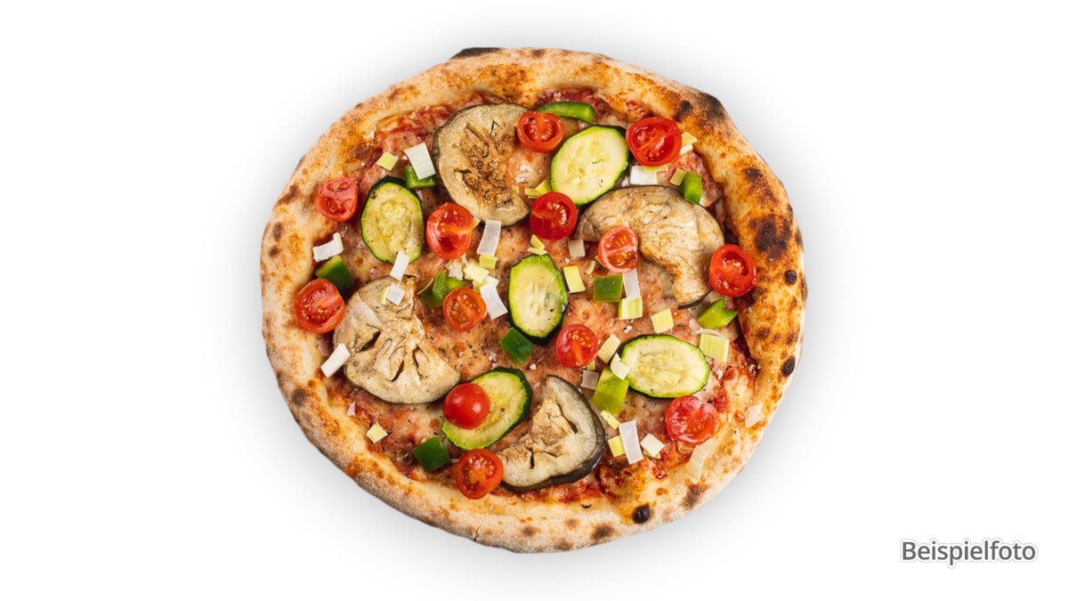 mediterran belegt mit Tomatensoße, Mozzarella, Auberginen, Zucchini, einem Hauch Knoblauch und Feta