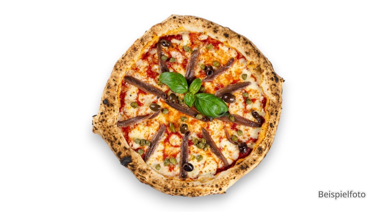 mit Tomatensoße, Mozzarella, Kapern, Oliven und feinen Sardellen
