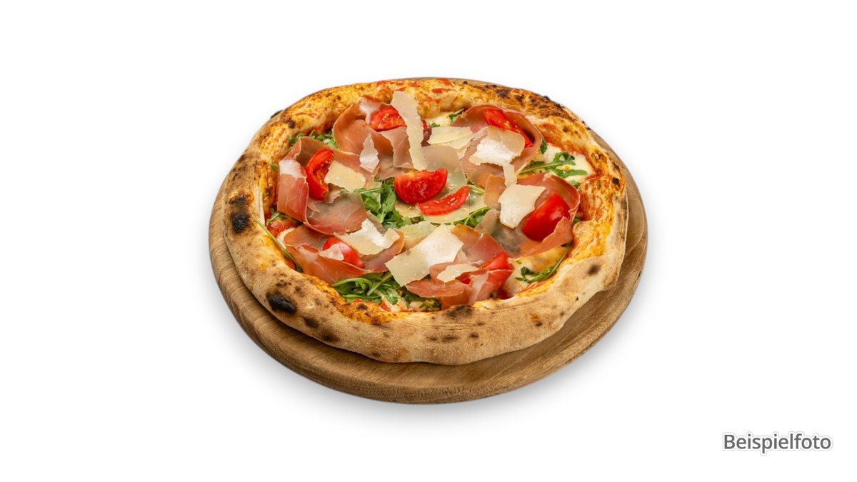 mit Tomatensoße, Mozzarella, feinstem Parmaschinken, frischem Rucola und gehobeltem Parmesan