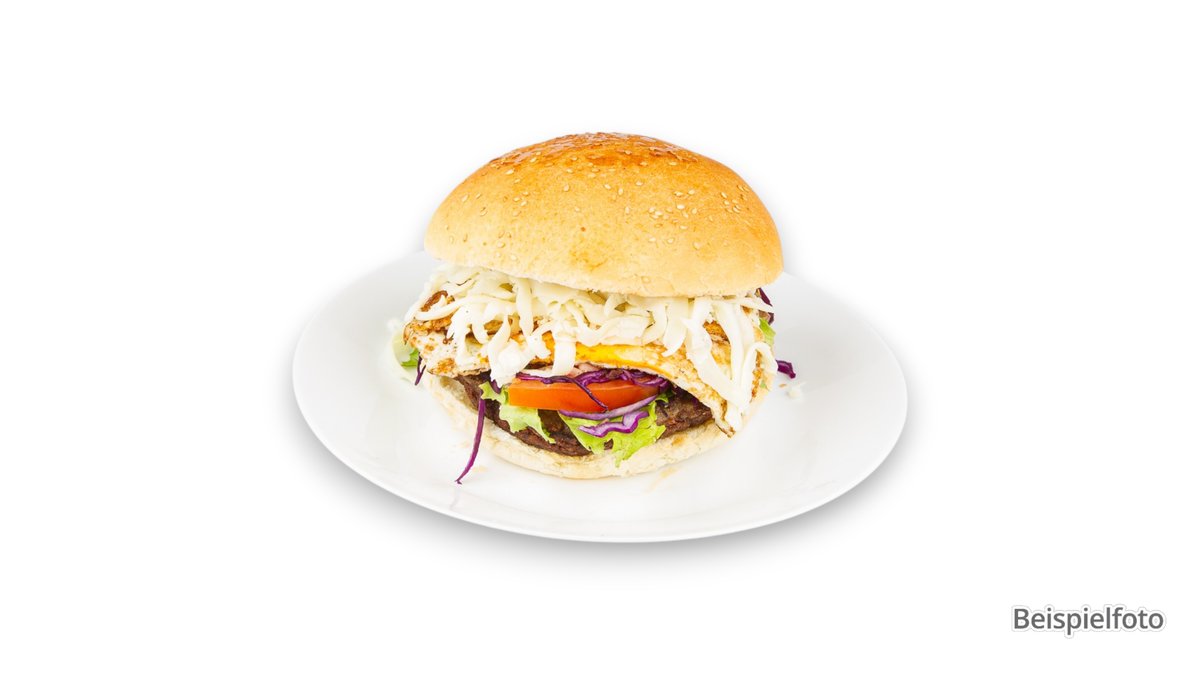halbierter Burger mit zwei saftigen Rindfleischpatties, gesmashed, mit doppeltem Cheddar, hausgemachten Röstzwiebeln, Ketchup, Hamburger Botschaft-Soße und einer Soße deiner Wahl