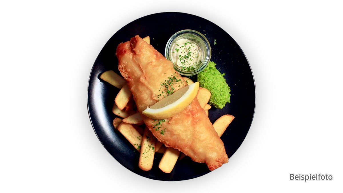 Fischfilet im gebackenen Bierteig, serviert mit Pommes frites, Soße Tartare, Zitrone und Salat Enthält kein Alkohol, 0,0% genutzed um es zu machen.