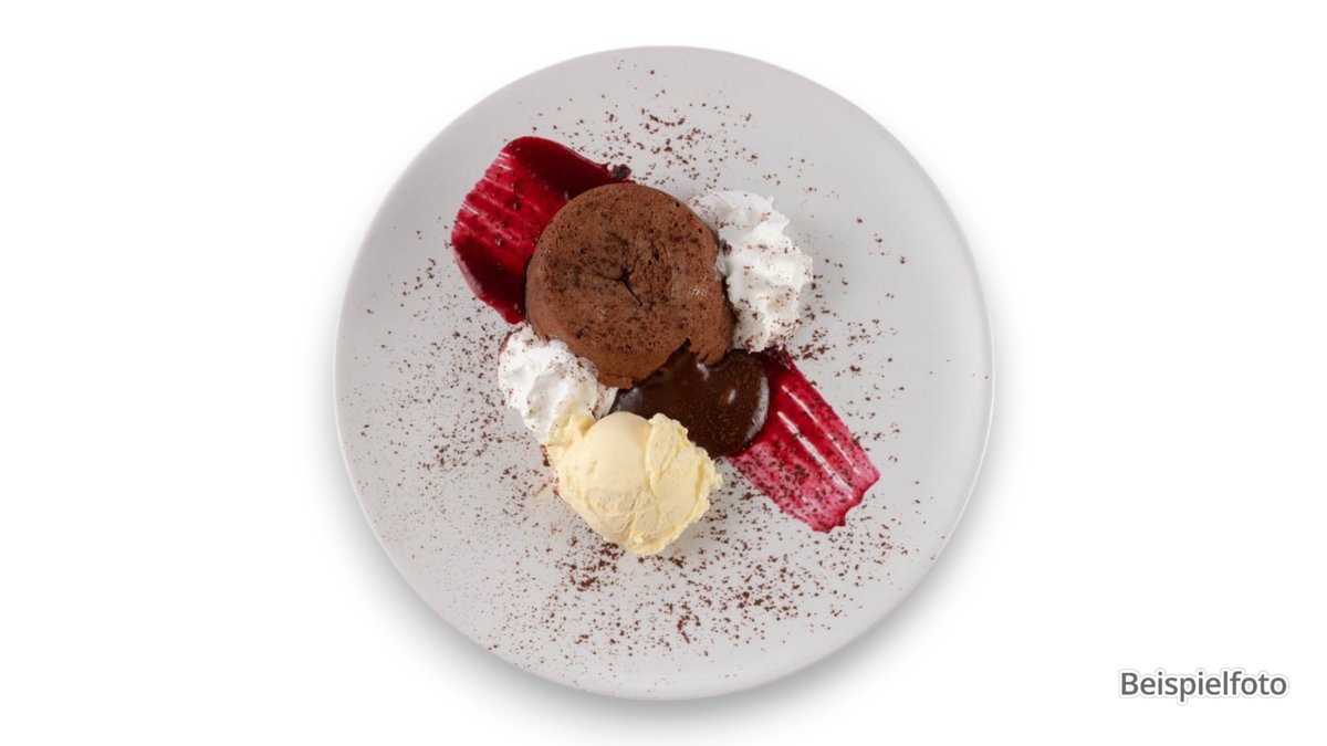 warmer Schokoladen-Lava-Cake mit zartem, flüssigem Schokoladenkern Das Gericht wurde mit Schokolade zubereitet und kann Spuren von verschiedenen Nüssen enthalten