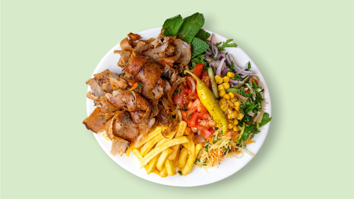 mit Kalbfleisch, Pommes, Gurken, Tomaten, Eisbergsalat, Zwiebeln, Mais, Bohnen und Peperoni