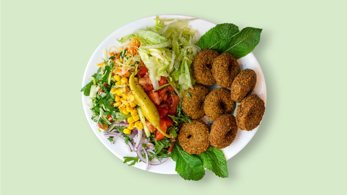 Alle Falafeln werden mit frisch frittierten, gewĂĽrzten Kichererbsenringen, Gurken, Tomaten, Eisbergsalat und Minze serviert