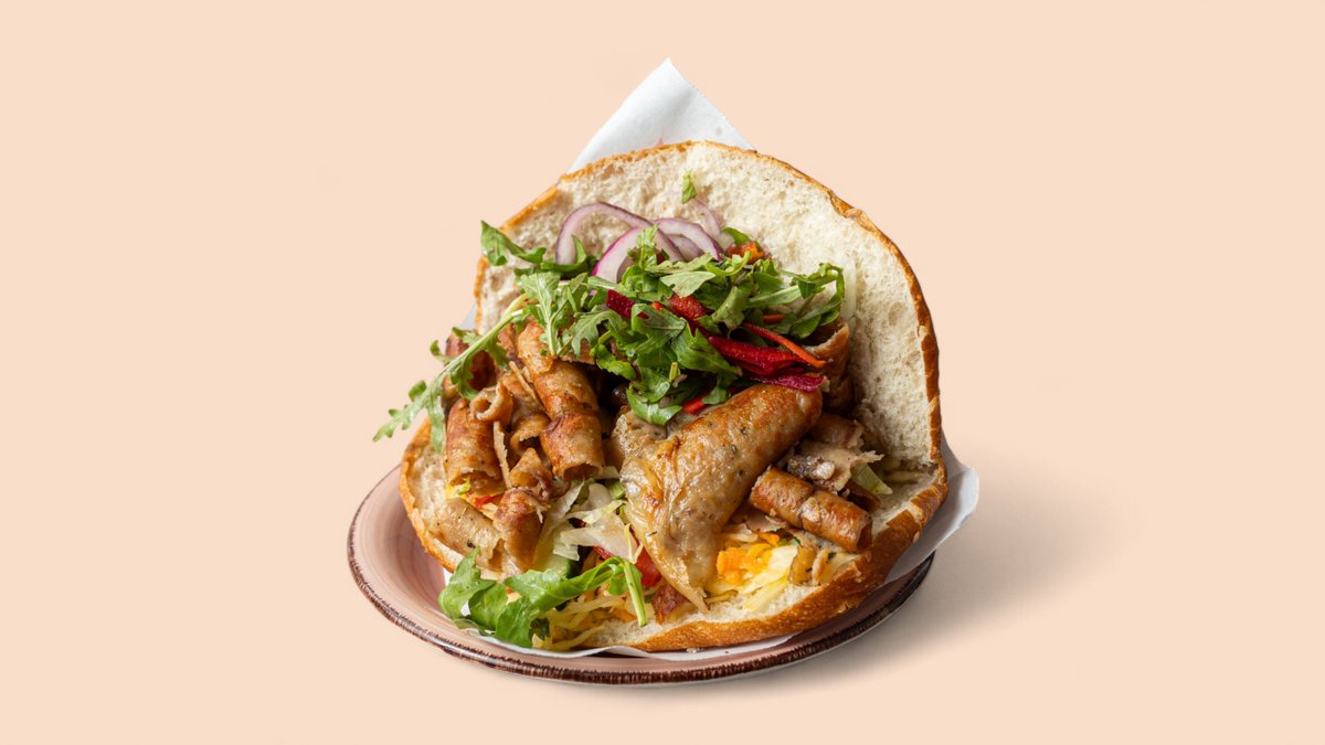 mit Kalbfleisch, WeiĂźkohl, Gurken, Tomaten, Eisbergsalat, Zwiebeln und selbstgemachtem Teig im Ofen gebacken