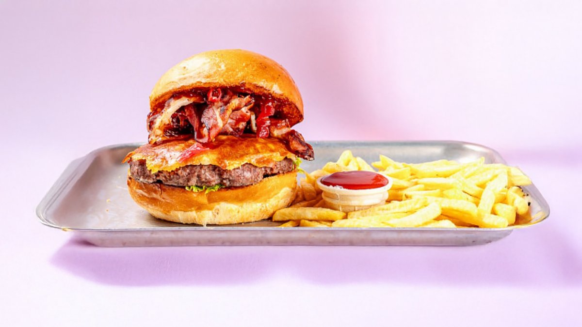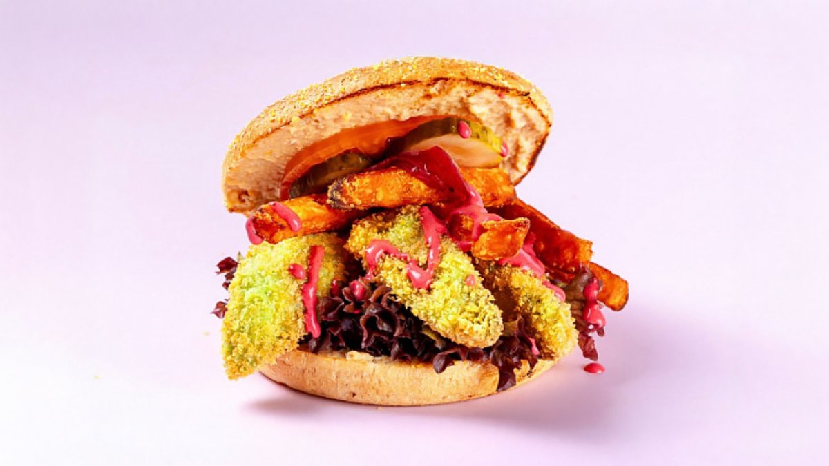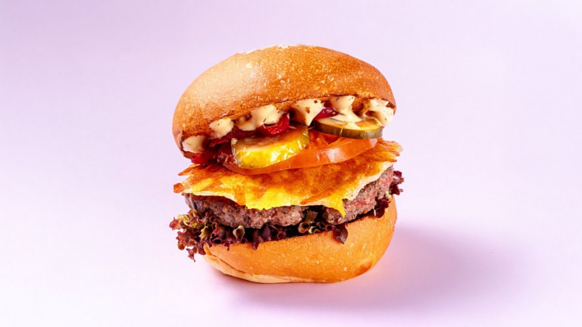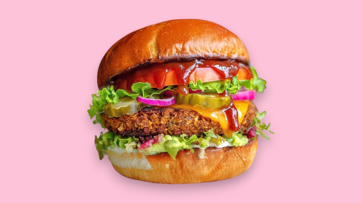 mit 113g Beyond Meat Patty, veganem Käse, Tomate, Essiggurken, karamellisierten Zwiebeln, Salat, veganer Honey’s Sauce