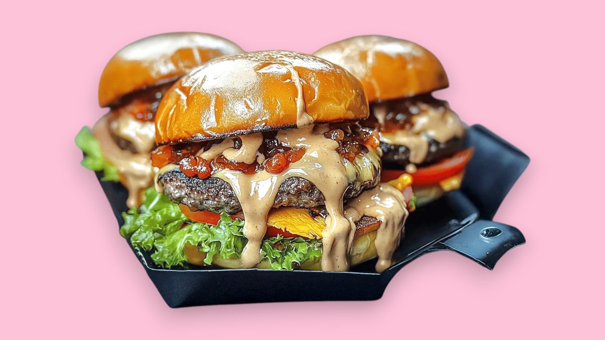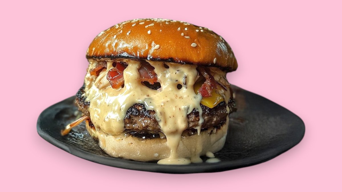 150 Gramm Rindfleisch, Mayo, Joppiesoße, Käse und karamellisierte Zwiebeln