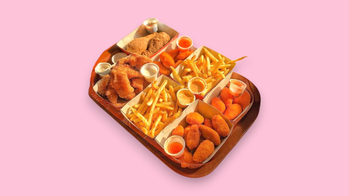 alle Menüs erhalten Burger, Pommes Frites, Dip und Getränk nach Wahl